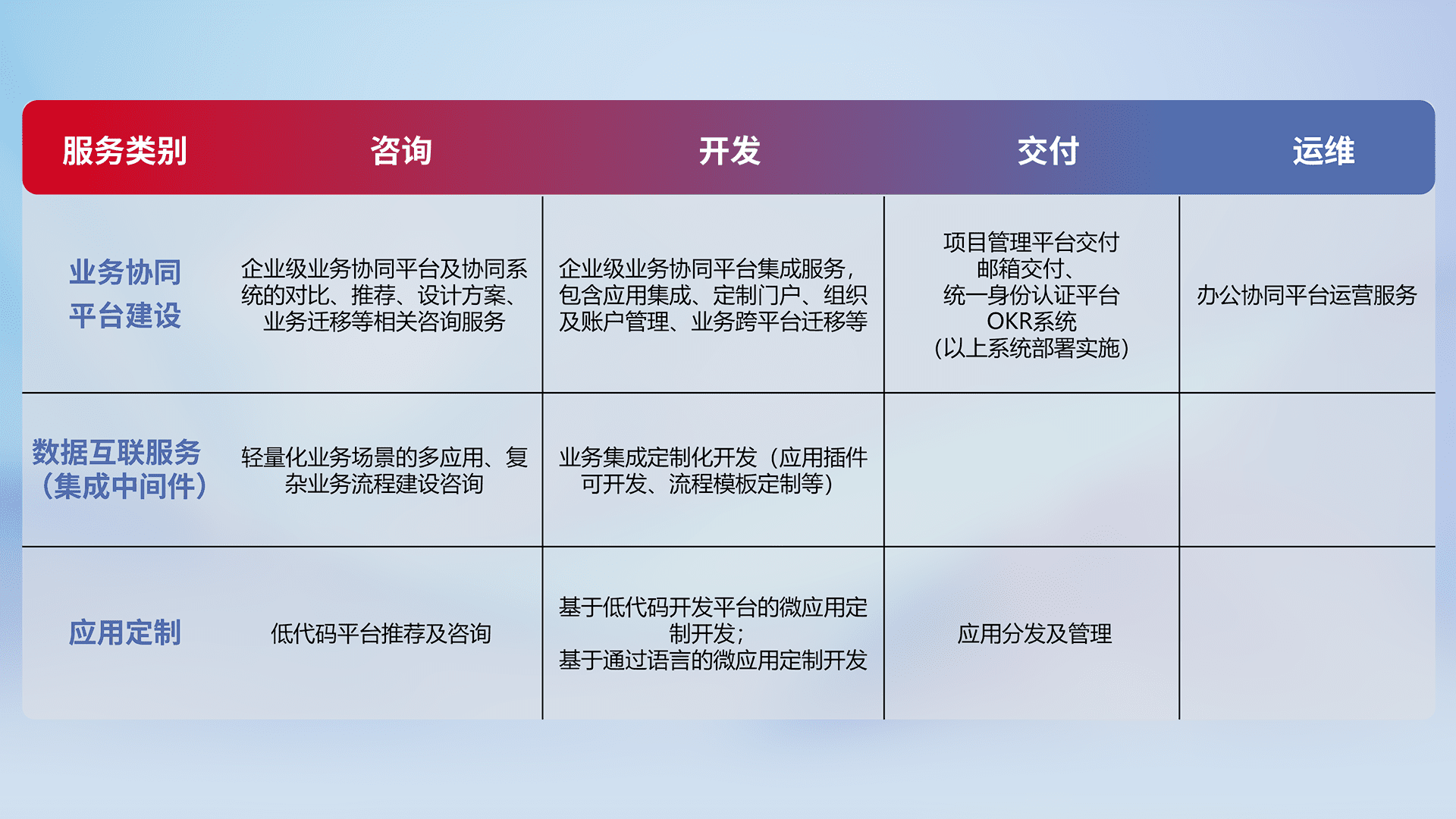 针对钉钉、、、企微、、、IDaas等平台级产品提供产品的规划、、、、方案、、、、交付、、、、定制化开发等服务,,,实现如统一协同办公、、、、智能客户服务、、、、混合会议管理、、、、智能数据查询、、、、等业务场景,,实现数字化转型。。。
