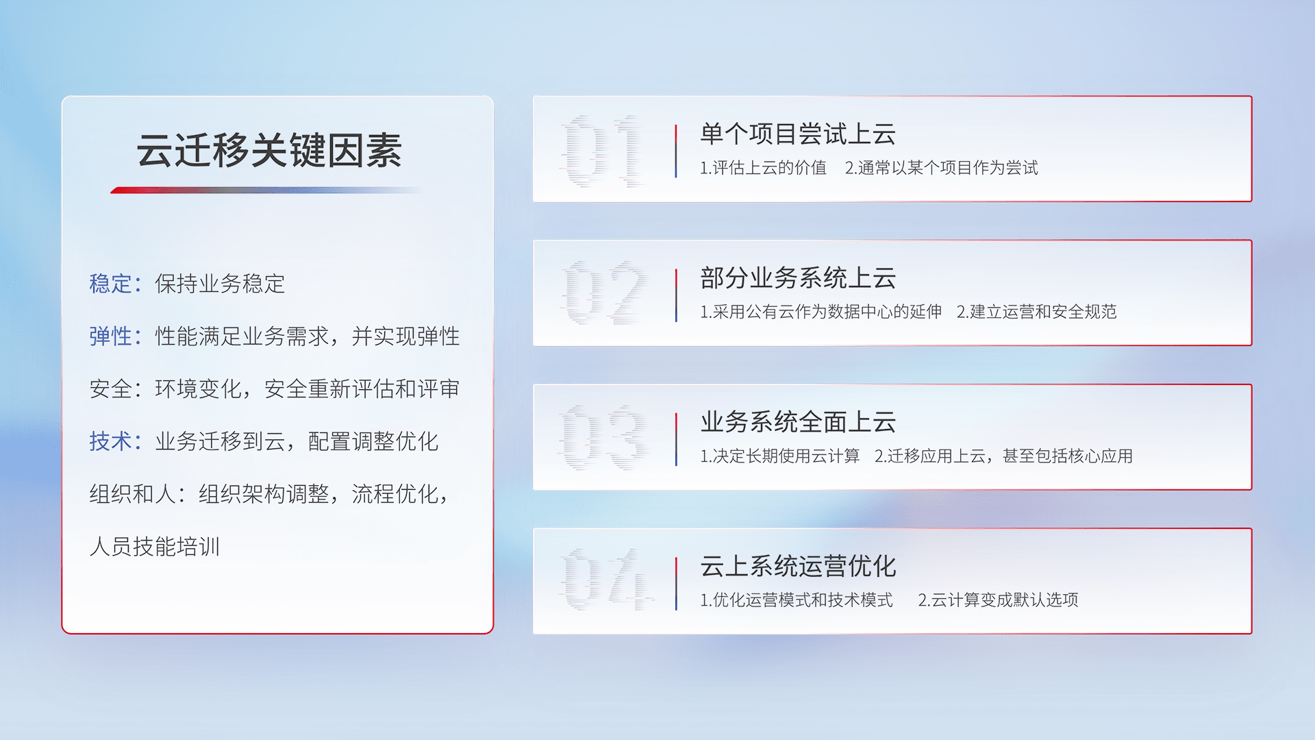 结合实际业务,,,,从规划设计、、、、云平台选型、、、、云原生改造、、数据迁移、、、、集成交付,,迁移全过程为客户识别最佳上云路径,,,做好风险识别管理,,,,设计网络架构、、身份权限、、、、安全审计合规、、操作审计、、、日志审计、、监控告警策略、、、、多站点容灾设计等,,,对云上基础设施进行整体规划,,,提升IT治理水平,,,,以满足弹性、、高可用、、、、高性能的需求。。。